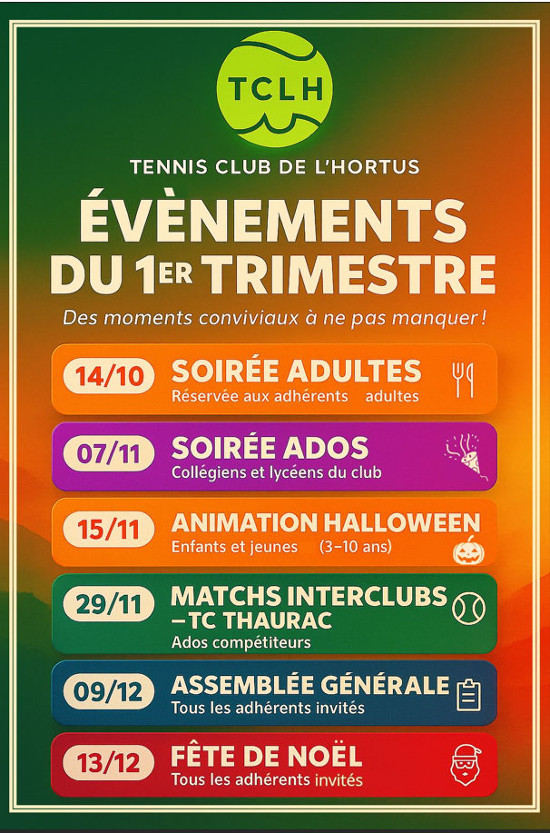 Découvrez nosDernières actualitésNOS ACTUS Le planning des cours 2025 - 2026 Téléchargez le planning des cours de tennis 2025-2026 TC Hortus